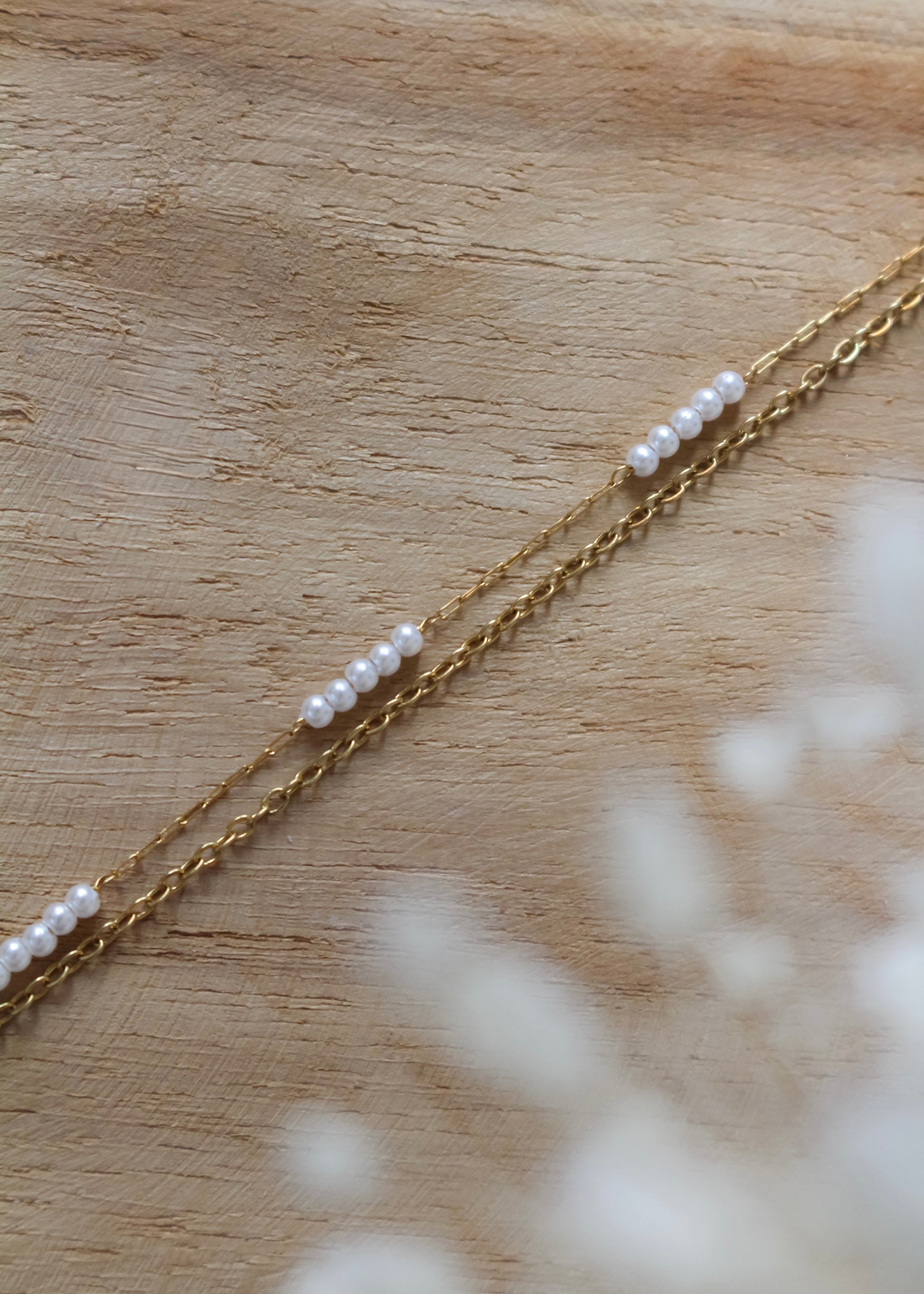 Bracelet double chaîne en acier inoxydable et de toutes petites perles nacrées.